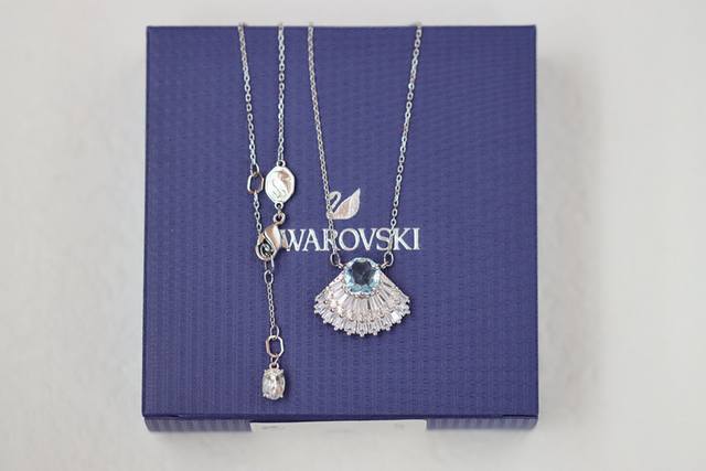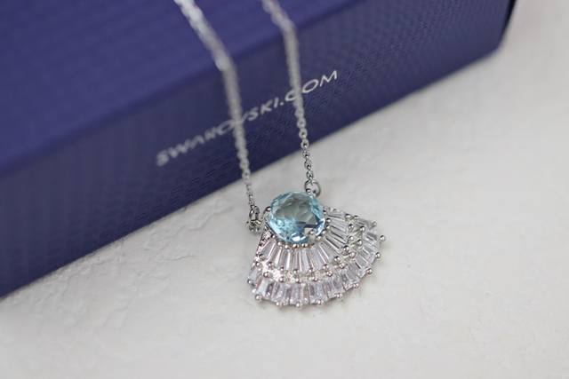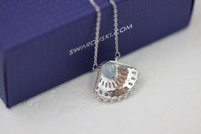 蓝钻水晶贝壳 锁骨项链 这款海洋风格的链坠是表达对海洋热爱的完美方式P优雅的链条采用镀铑设计,中央饰有贝壳图案,并点缀透明合成立方氧化锆,镶嵌一颗明亮的蓝色仿水