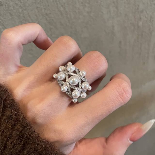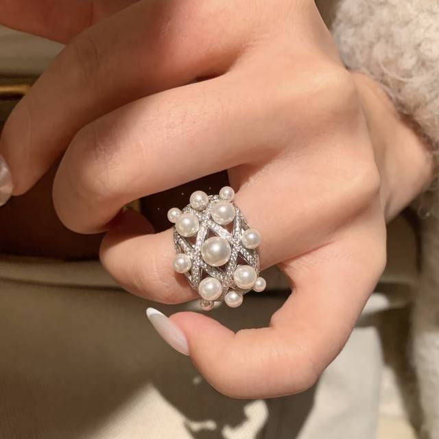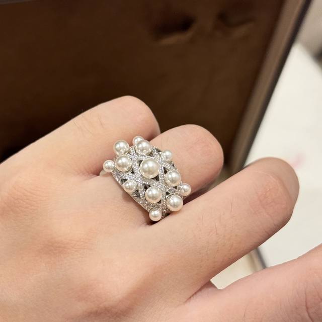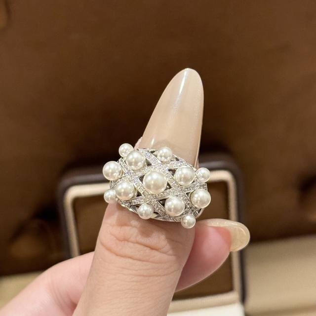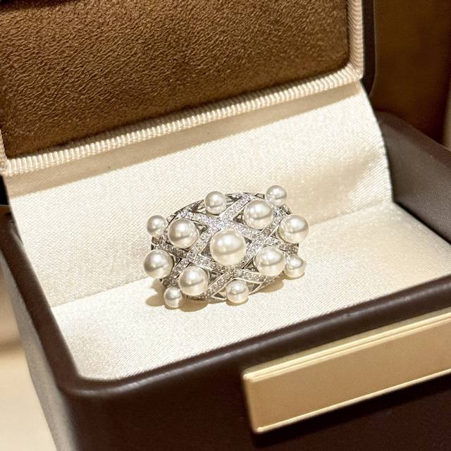 A6846 小香风 欧美奢华款 满钻 珍珠 戒指 镶嵌Aaaaa级高碳钻 搭配天然贝珠 个性时尚 引领潮流 通体925纯银 镶嵌工艺 女神必备时尚单品 电镀厚金