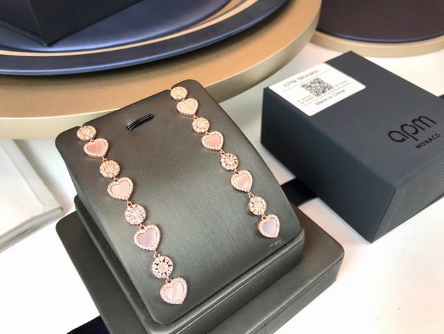 Apm Monaco 新品粉贝母多爱心长款流苏耳钉!个性爱心设计,将爱意萦绕耳间,以温润粉贝母搭配玫瑰金色诠释女性优雅格调,绽放璀璨光芒,简约不失细节,让每个日