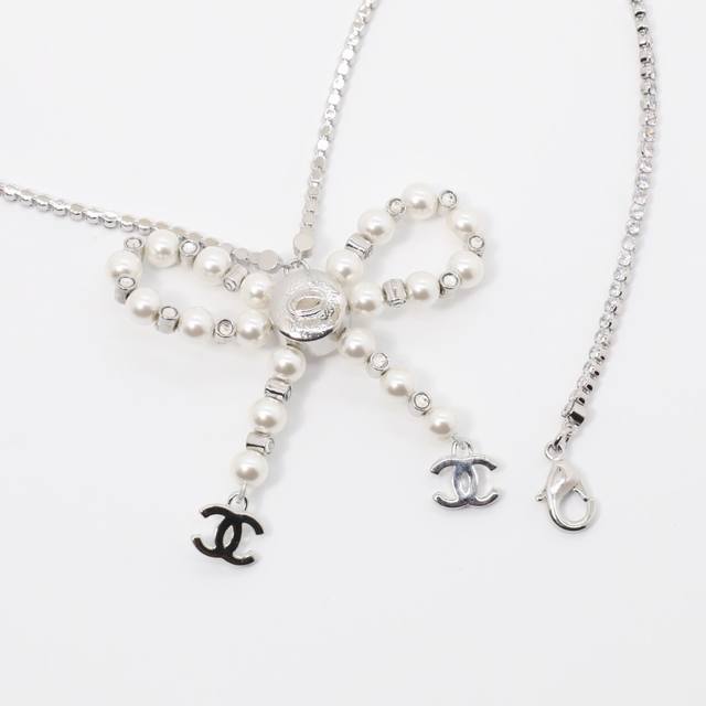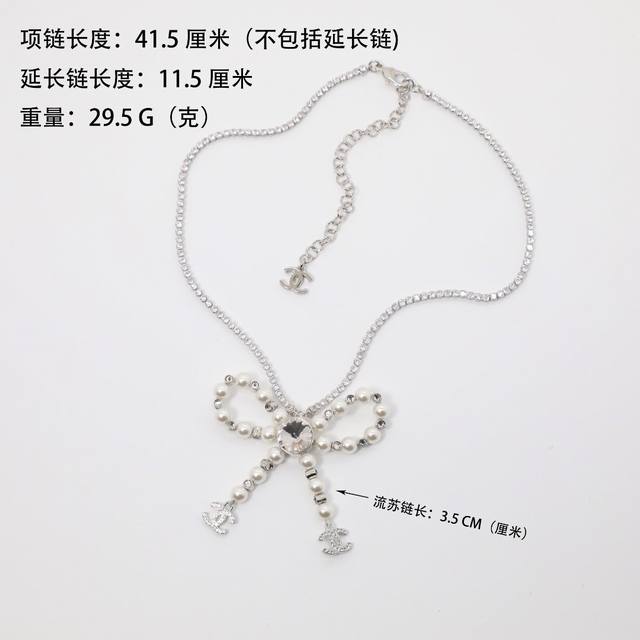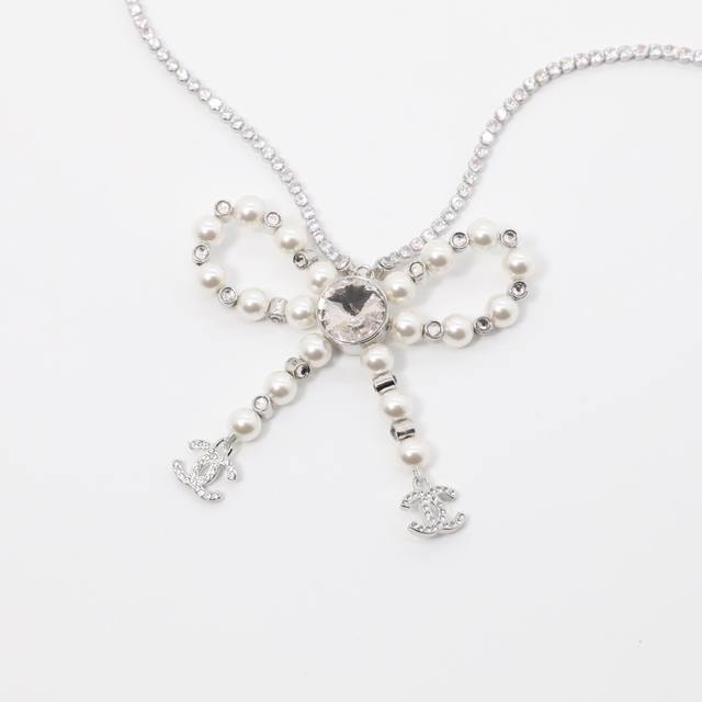 Ch Nel 项链 ,白金色水钻链珍珠水钻蝴蝶结流苏吊坠项链。 DDD