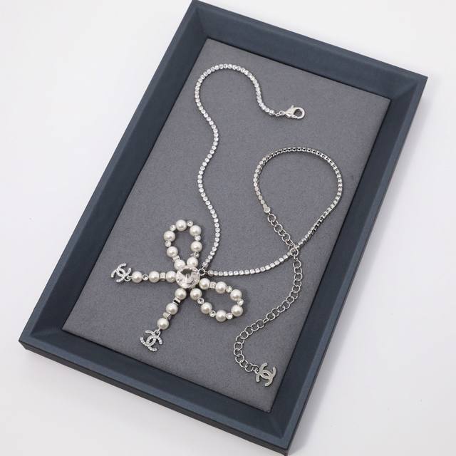 / Ch Nel 项链 ,白金色水钻链珍珠水钻蝴蝶结流苏吊坠项链。