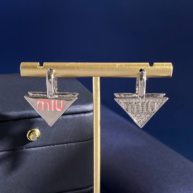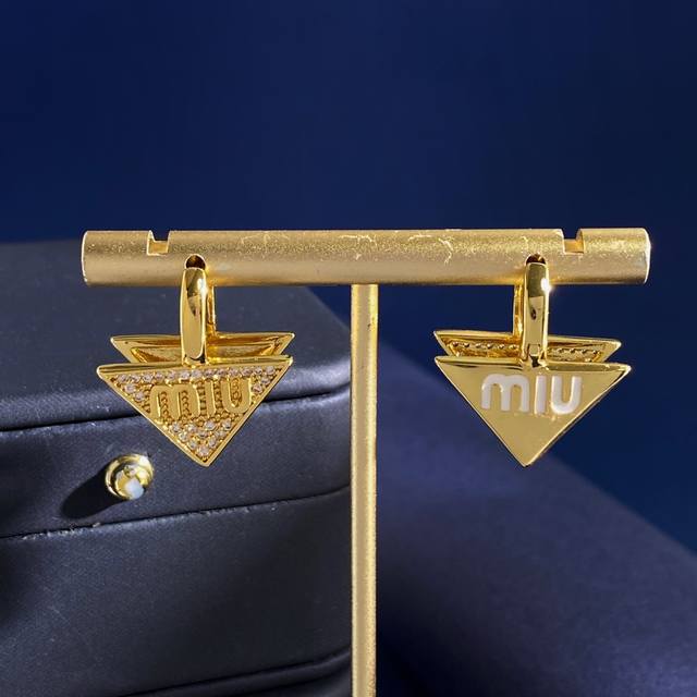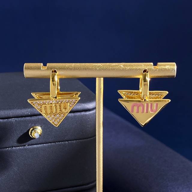 / Miumiu缪家高级感时尚个性双面设计一面满钻一面光面Miu字母滴油耳环 黄铜材料 5个色 重约8.9G 总高约2.2Cm 三角形约2.1Cm*1.1Cm*0.