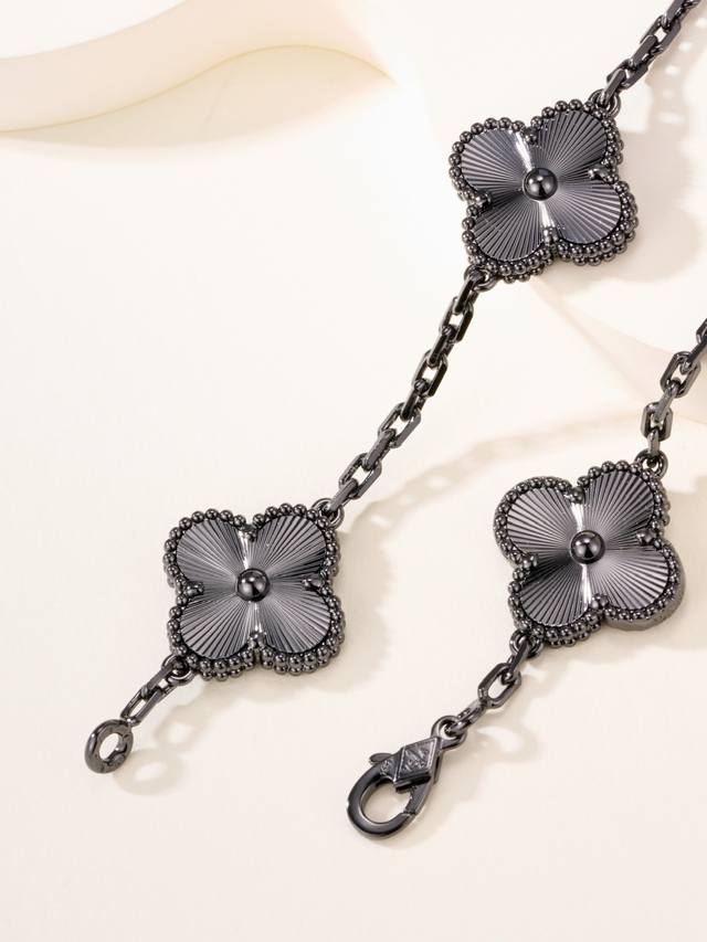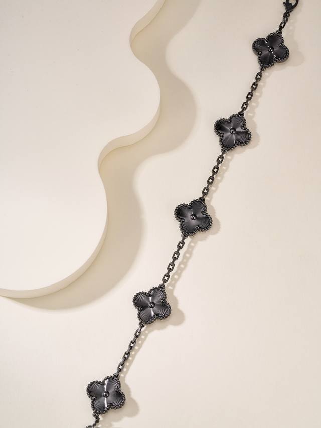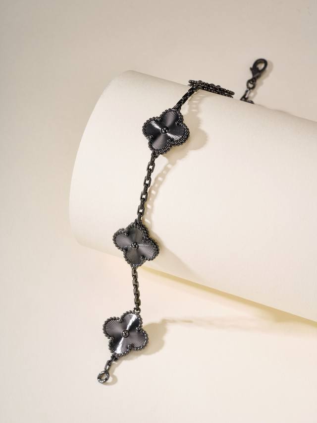 FFF P价 DDD 黑金镭射五花手链 腕间的奢华低语,终于把梵克雅宝黑金镭射五花手链收入囊中,来给姐妹们分享一下佩戴心得。独特设计,吸睛无数。 DDD 它的设计真的太独特了,镭射工艺让每一片花瓣都闪烁着神秘而迷人的光彩,在不同光线下变幻无穷。黑金配色更是经典中的经典,既有着金色的奢华大气,又被黑色中和得恰到好处,不会过于张扬,却又能在不经意间吸引所有人的目光。每次抬手,都仿佛是一场光影的艺术表演在腕间展开,那种独特的魅力让人无法抗拒。舒适贴合,如丝般顺滑 DDD