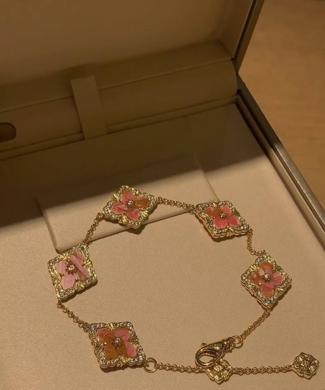 梵克雅宝手链 Vca四叶草手链间钻手链五花手链,亚金材质电镀18K金色!链长可调节!间钻五花手链