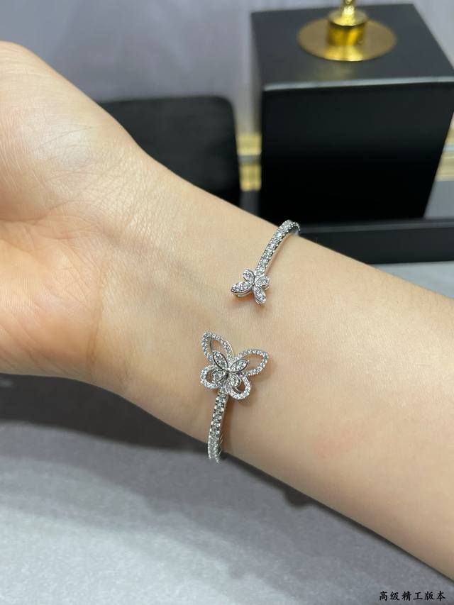 V金材质 格拉芙新版蝴蝶开口手镯,高级珠宝作品 线条灵动的蝴蝶结或环绕指间、或在颈窝处闪耀、亦或在耳畔划出完美弧度,以大胆的风格演绎现代高级珠宝风格。