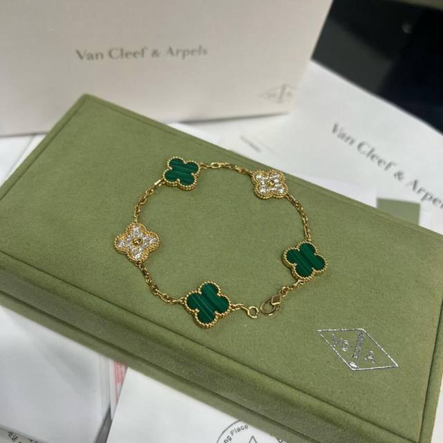 / V金材质Vca黄金色孔雀石间钻四叶草五花手链