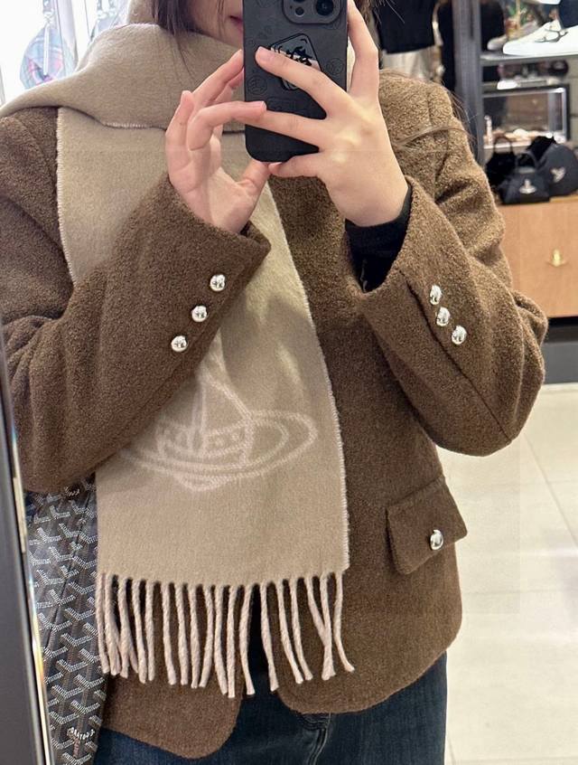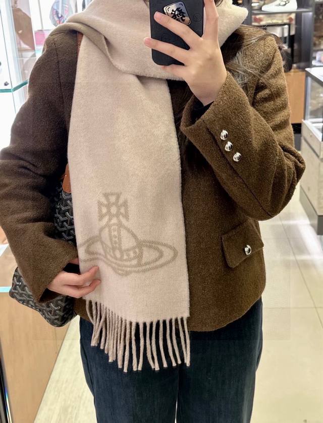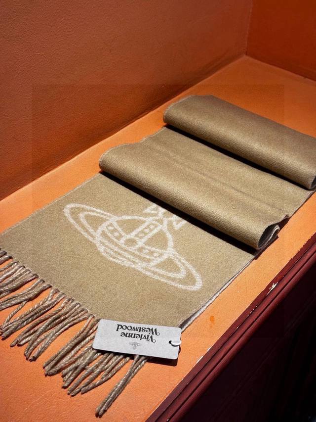 原单品质!英国朋克教母 “太后Vivienne Westwood”最爱的土星 从精神上,Vivenne Westwood才是最能代表英国人的时尚品牌.本季强推的一款产品.大“土星”Logo提花,土星的意义也是和西太后的设计理念是一致的.面料采用了100%最具张力羊毛混绒,尺寸:185*26,双面设计,手感柔软不扎手,超级受追捧的爆款!