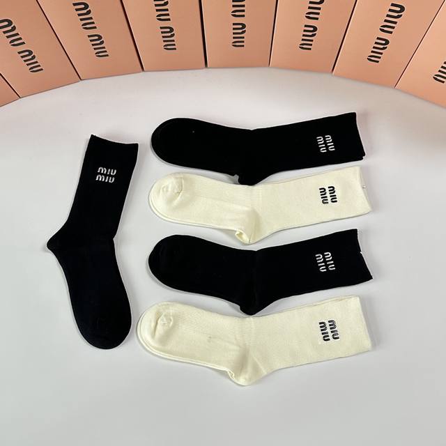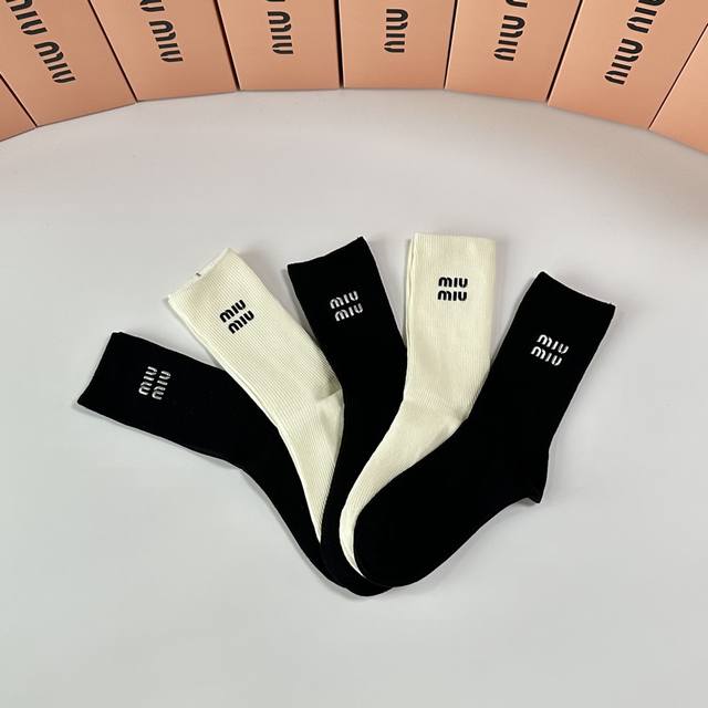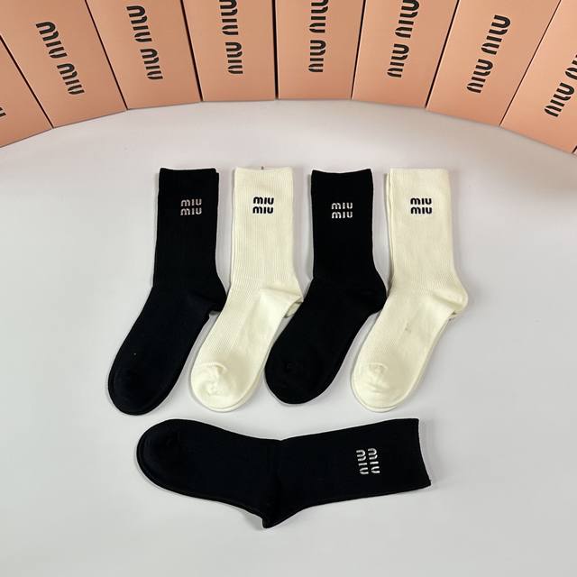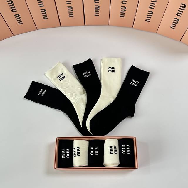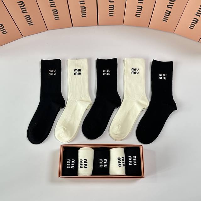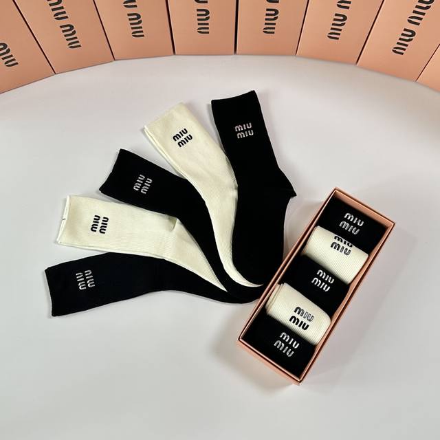 / 特 配专柜包装 Miumiu 缪缪 新款烫印中长款堆堆袜袜子!一盒五双,专柜同步筒袜袜子,大牌出街,潮人必备超好搭。