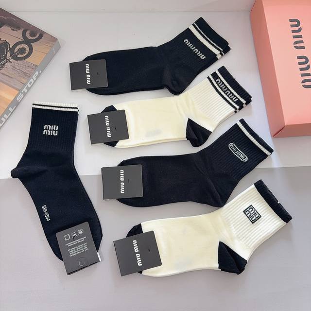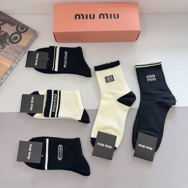 配包装 一盒5双 Miumiu 缪缪 新款中筒男款袜子,纯棉面料,潮人必备 ,经典字母 个性时尚百搭款,你值得拥有哦