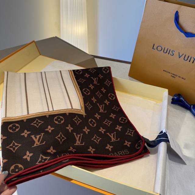 / Monogram Infinity 方巾依托印花工艺将 Monogram 图案巧妙铺陈于莹润桑蚕丝,再以 Damier 饰边与织纹标识彰示品牌风范,瞬间俘获视觉