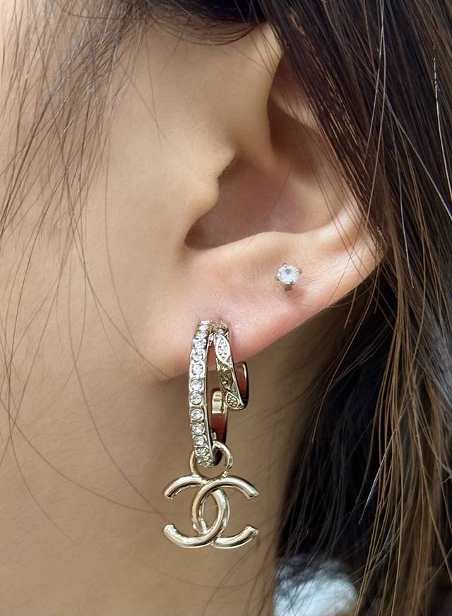 新款Chanel26C双圈耳环 香奈儿26C双圈耳环,经典双C标志设计,金属镶水钻,淡金色调超有质感
