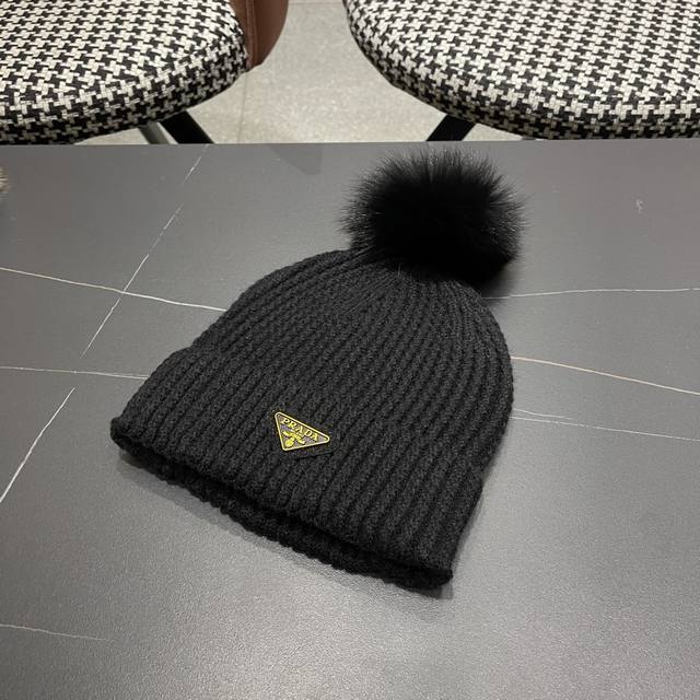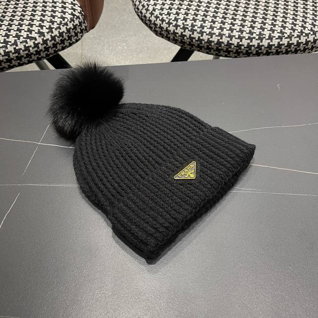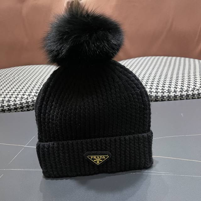 普拉达Prada 2025秋冬0配狐狸毛球专柜针织毛线帽,超火爆质感一流,出街超好搭配!减龄神器