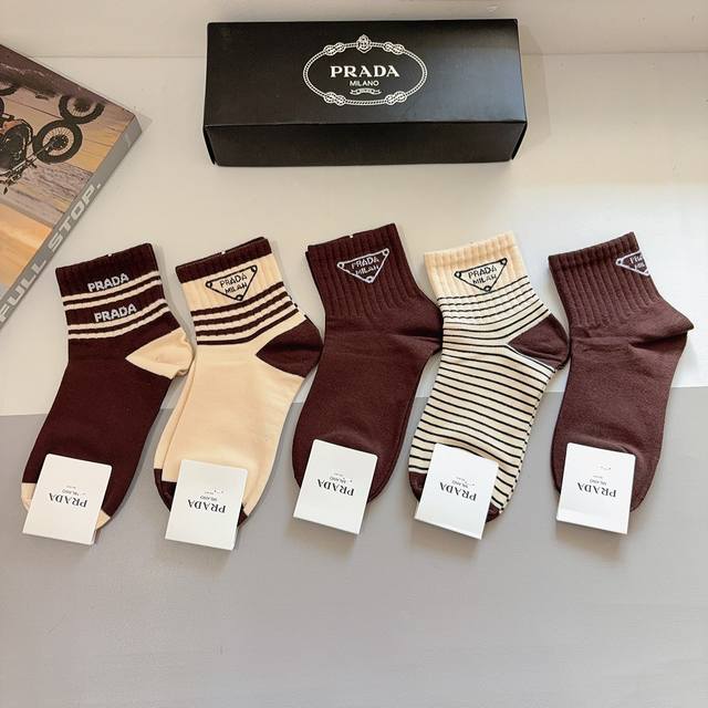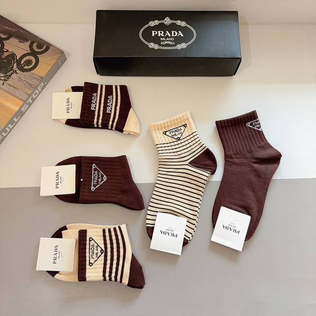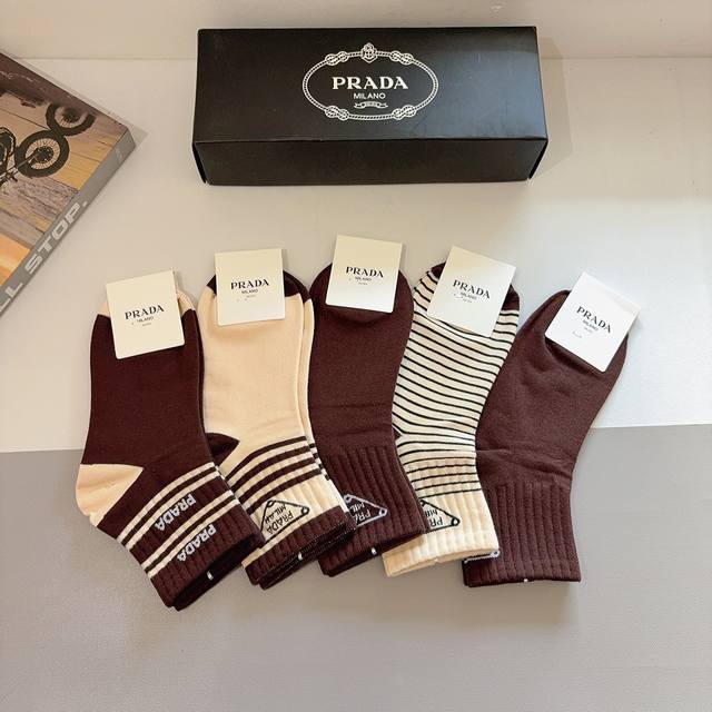 配包装 一盒5双 prada 普拉达 新款中筒袜子,纯棉面料,经典三角标Logo 个性时尚百搭款,你值得拥有哦
