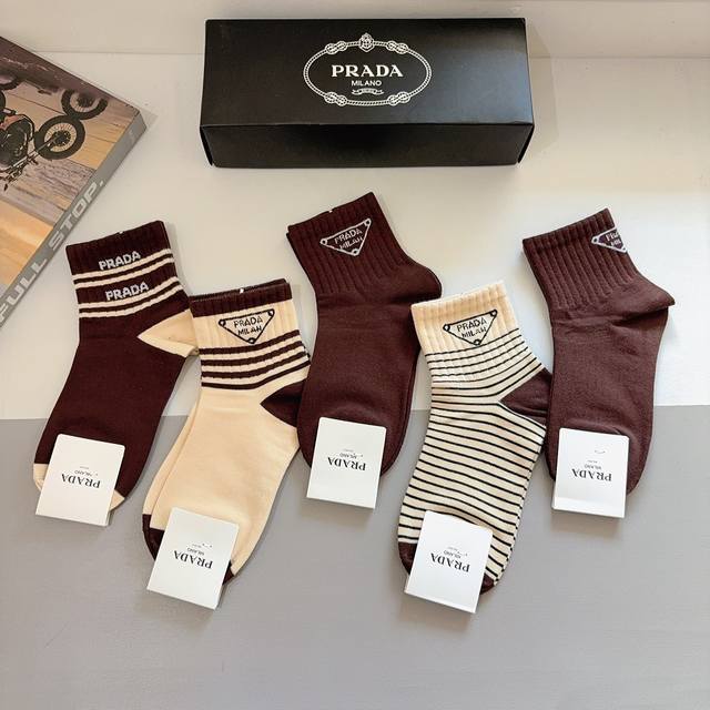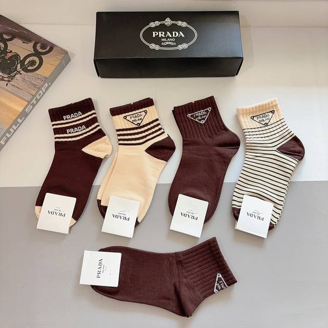 / 配包装 一盒5双 prada 普拉达 新款中筒袜子,纯棉面料,经典三角标Logo 个性时尚百搭款,你值得拥有哦