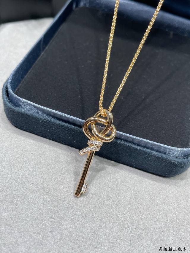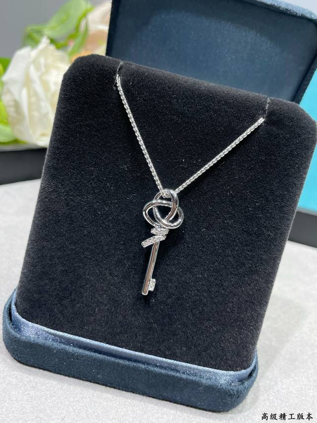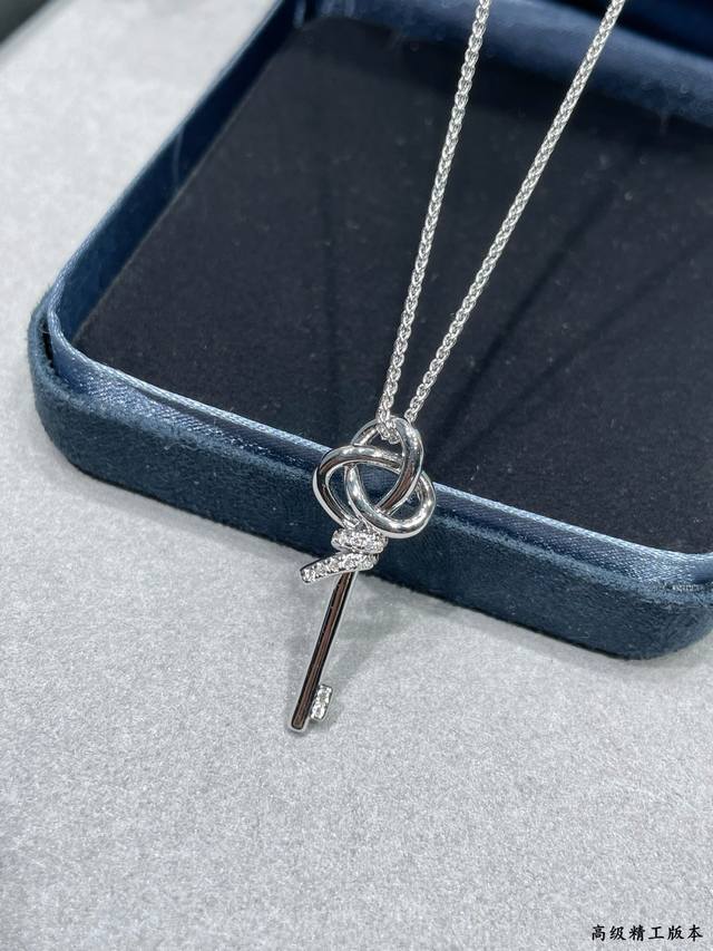 / V金材质 蒂芙尼小号半钻T绳结钥匙项链。犹如明灯指引人们通向乐观与希望,Tiffany Keys 系列象征着光明的未来。璀璨夺目的钻石点缀迷人吊坠的优雅曲线。1