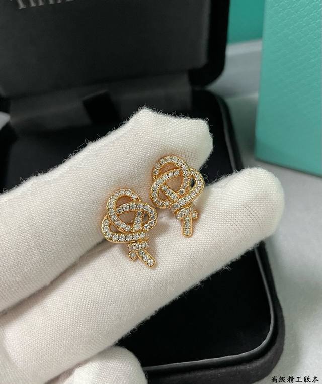 / V金材质 蒂芙尼满钻T绳结钥匙耳钉。犹如明灯指引人们通向乐观与希望,Tiffany Keys 系列象征着光明的未来。璀璨夺目的钻石点缀迷人吊坠的优雅曲线。18K