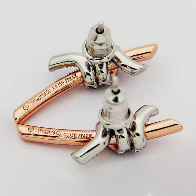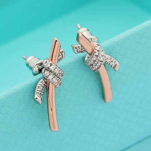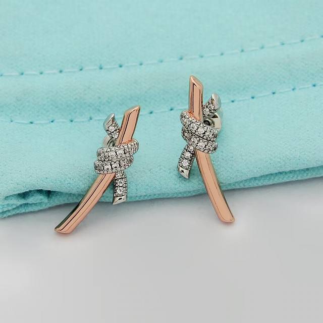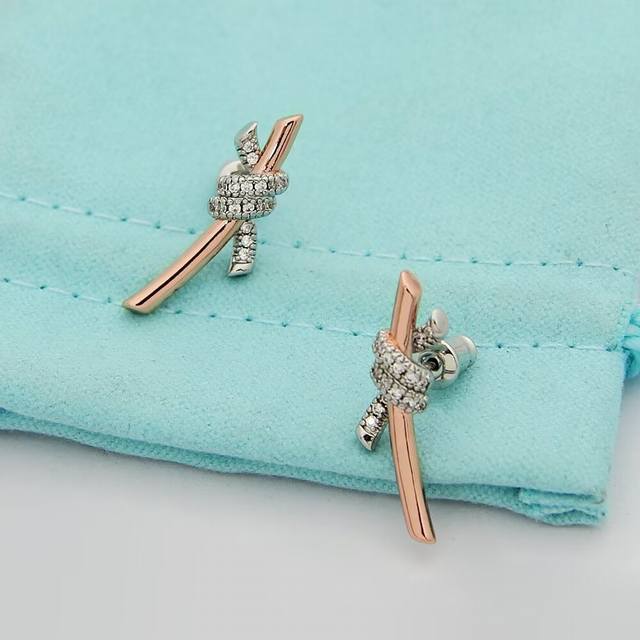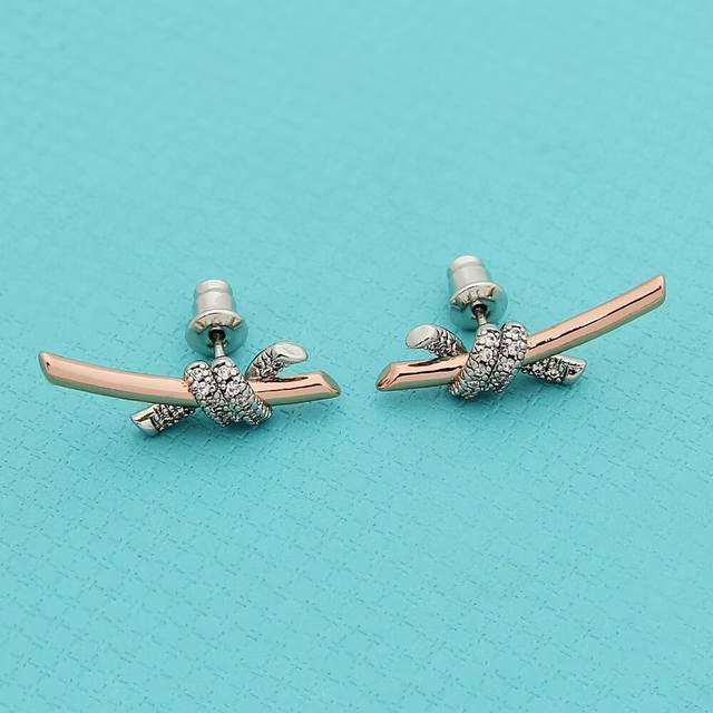 Tiff缘系列蒂芙尼间色半钻打结耳钉 亚金材质镶嵌高碳钻 以时尚别致缠绕绳结象征两人之前的特有连结 电镀厚金分色电镀耳钉