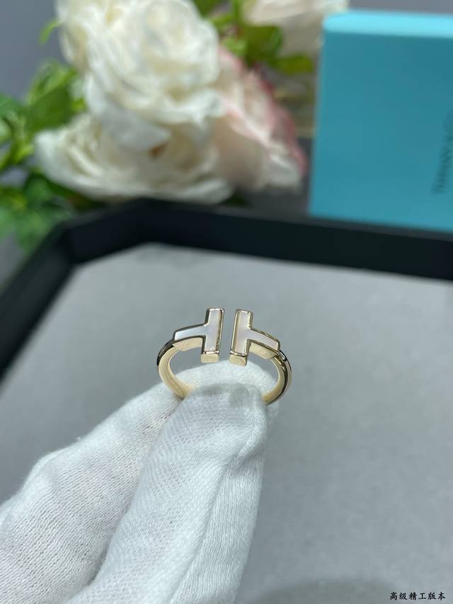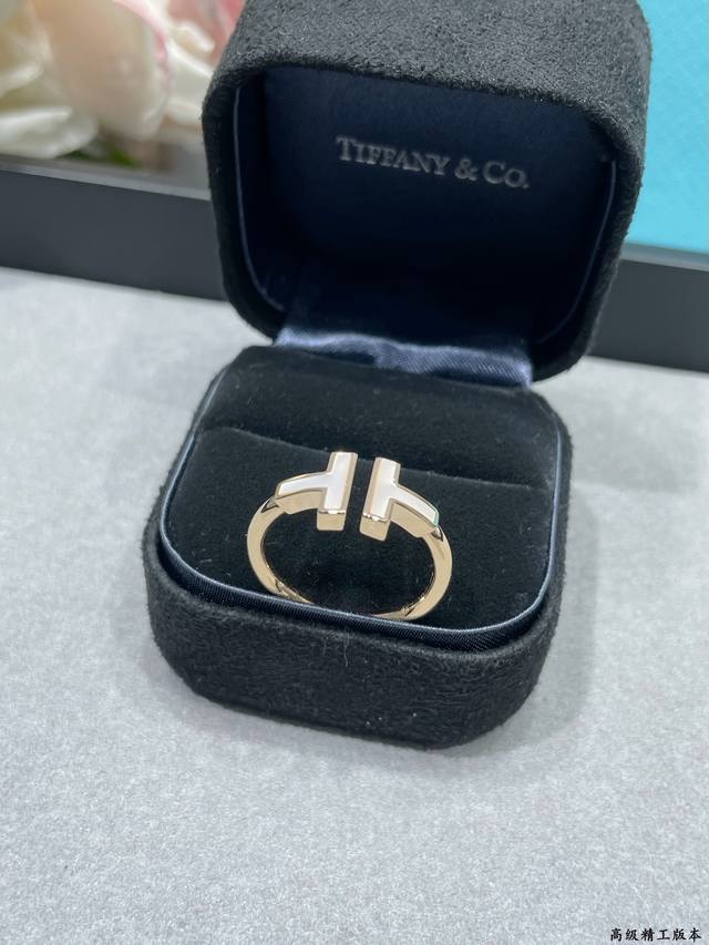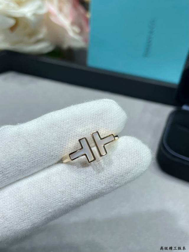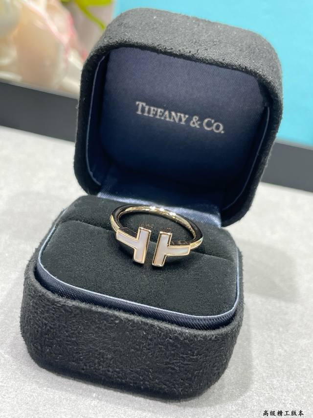 V金镀咪金 蒂芙尼双T贝母戒指码数5678。T Square 玫瑰金戒指By Tiffany镶嵌白色珍珠母贝 Square 戒指和手镯的轮廓更醒目大胆,均可以独