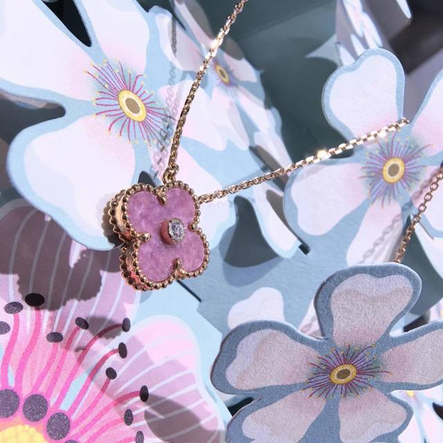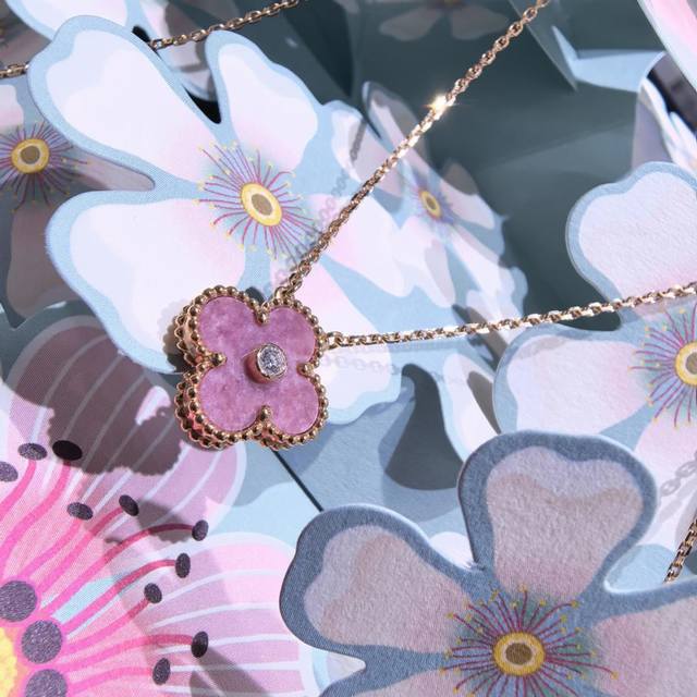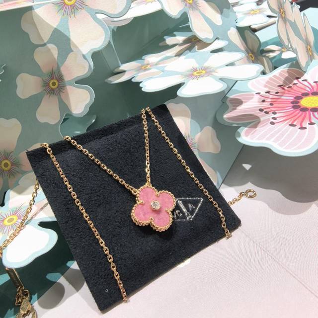 / V金材质梵克雅宝Vca四叶草蔷薇辉石镶钻项链