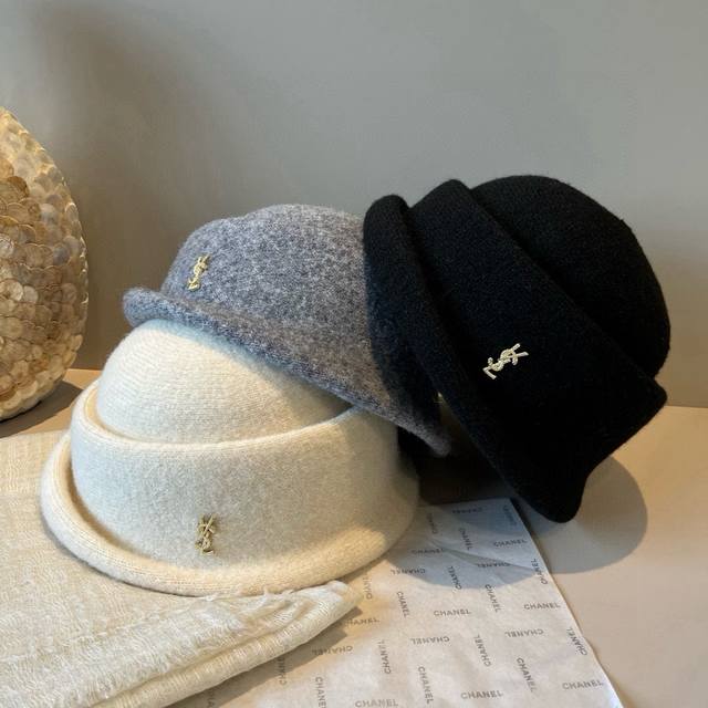 Ysl圣罗兰新款羊毛卷边盆帽,不规则剪裁设计,头围57Cm